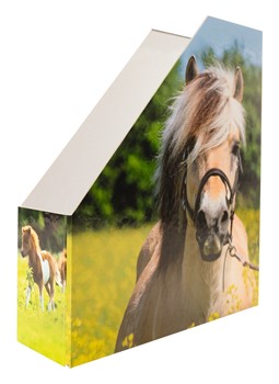 Stehsammler aus stabilem Karton. Optimal für DIN A4 Formate. Abwischbar und leicht zu reinigen. Gestaltet mit tollen Pferdefotos, der Hit bei Pferdefans. Mit praktischem Griffloch zum einfachen Herausnehmen. Zeitschriften, Broschüren, Kataloge, Mappen und Unterlagen platzsparend und optisch ansprechend aufbewahren.