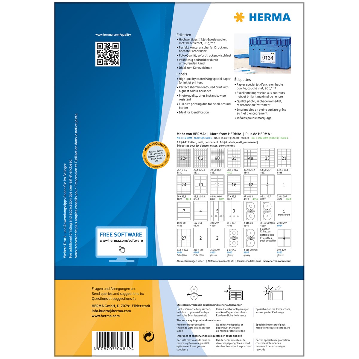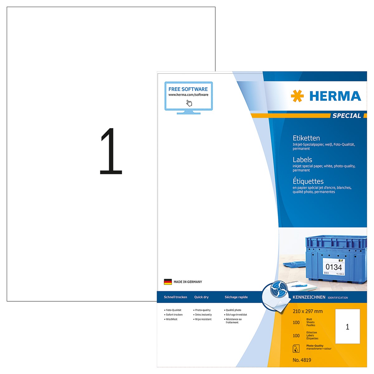 Etiketten, speziell für Inkjetdrucker, auf A4-Blättern, selbstklebend. Aus hochwertigem gestrichenem Spezialpapier, 90 g/m² für konturenscharfe und farbbrillante Drucke in Foto-Qualität. Störungsfreie Verarbeitung durch Rundum-Sicherheitskante und optimale Planlage. Alle Ausführungen mit umlaufendem Rand: vollflächig bedruckbar und ideal auch für Inkjetdrucker mit kritischen Papierführungen. Kostenlose Softwarelösungen: www.herma.de/software.