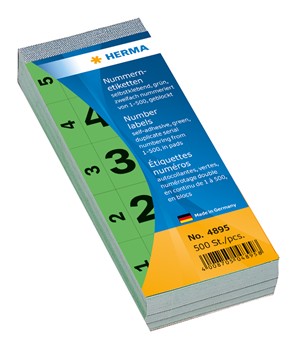 Nummernblock selbstklebend, aus Schreibpapier. Etikettenformat 28 x 56 mm zweigeteilt, Aufdruck von zwei identischen Nummern in Schwarz. Fortlaufend nummeriert von 1-500, jeweils 5 Doppelnummern pro Blatt. Blocks à 100 Blatt = 500 Doppelnummern.